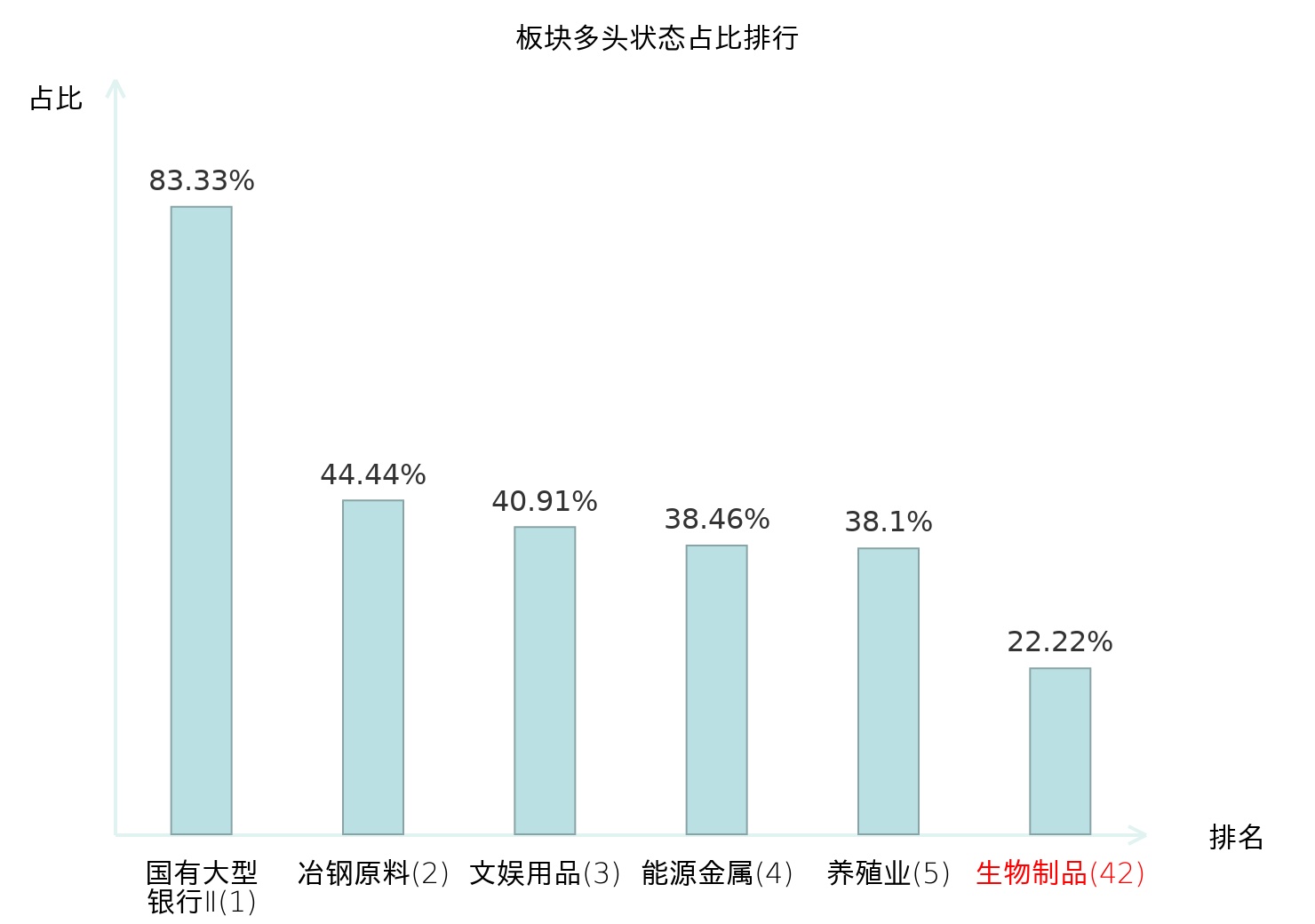 全市场所有行业板块中主力多头状态占比排名中,国有大型银行Ⅱ板块位居第一。影视院线板块名次提升最快,较昨日上升54位。
