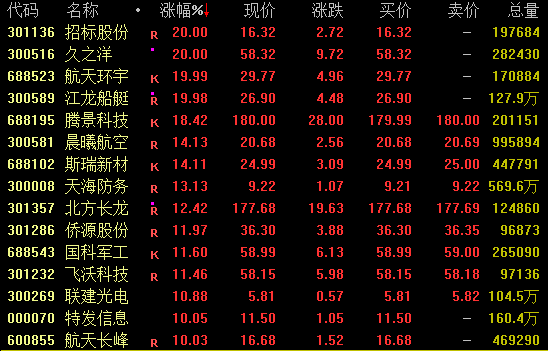 军工板块盘中大幅走高,卫星导航、商业航天概念等表现亮眼。截至收盘,招标股份、久之洋、航天环宇、江龙船艇等20%涨停,北方长龙涨超12%,中天火箭、长城军工亦涨停。