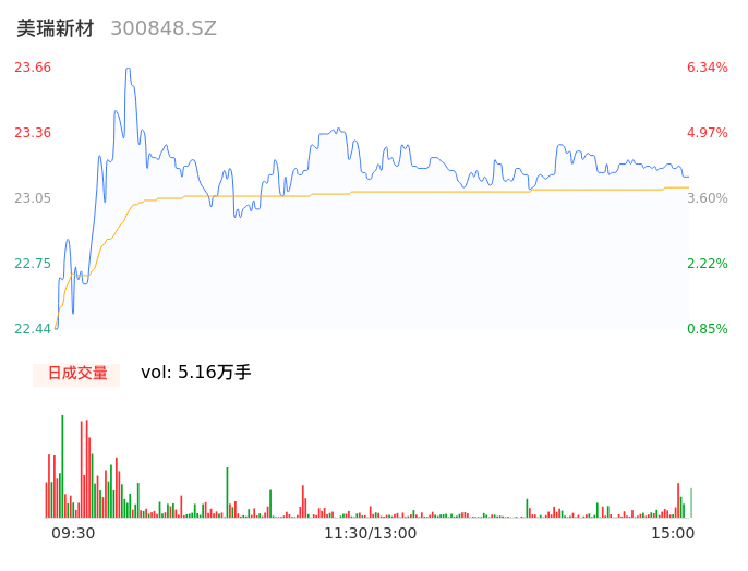 05月09日,美瑞新材收报23.12,股价涨幅3.91%,成交金额1.19亿元,换手率2.88%。