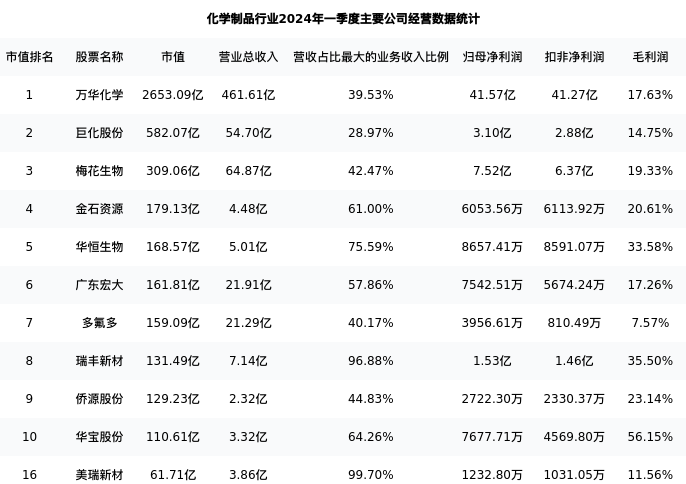 美瑞新材最新报告期数据为一季度,下表汇总了化学制品行业内市值靠前的公司一季度主要经营数据