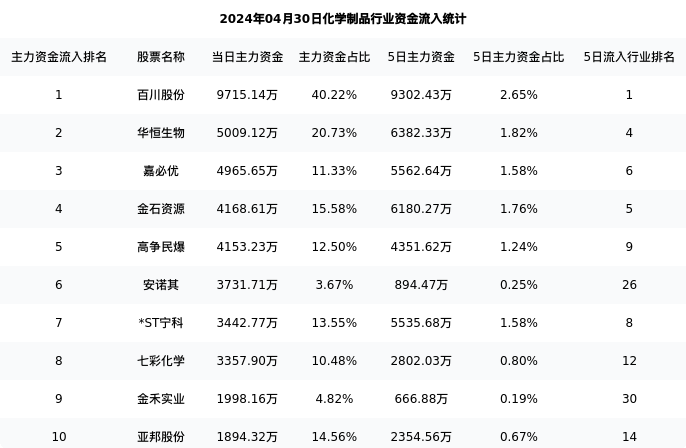 从主力资金流向来看,化学制品行业今日主力资金流入56.56亿元,在所有申万二级行业中排名:42/131。