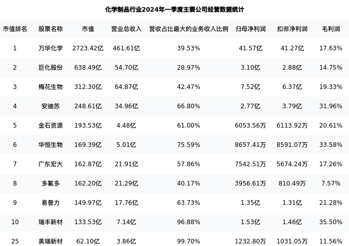 美瑞新材最新报告期数据为一季度,下表汇总了化学制品行业内市值靠前的公司一季度主要经营数据