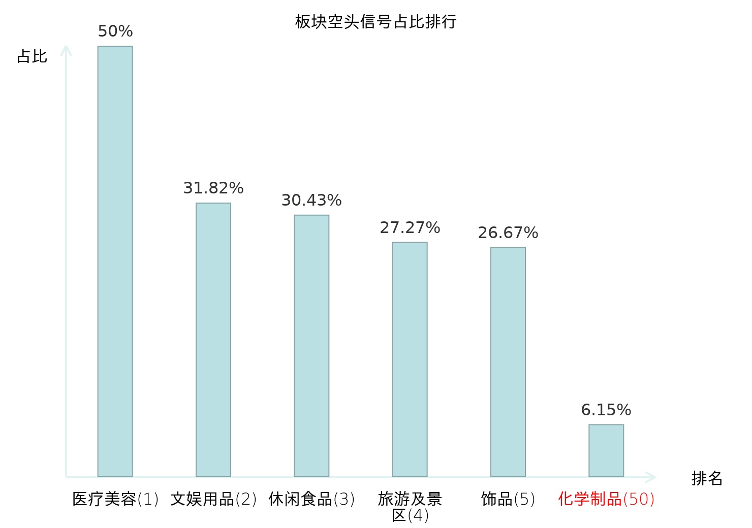 全市场所有行业板块中主力空头信号占比排名中,医疗美容板块位居第一。服装家纺板块名次提升最快,较昨日上升114位。
