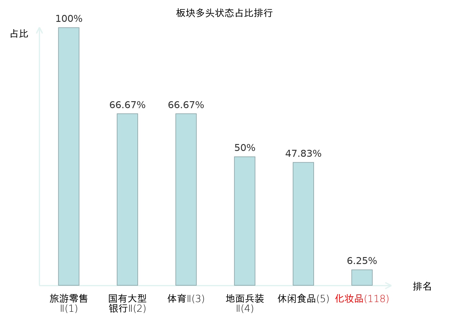 全市场所有行业板块中主力多头状态占比排名中,旅游零售Ⅱ板块位居第一。航空机场板块名次提升最快,较昨日上升80位。