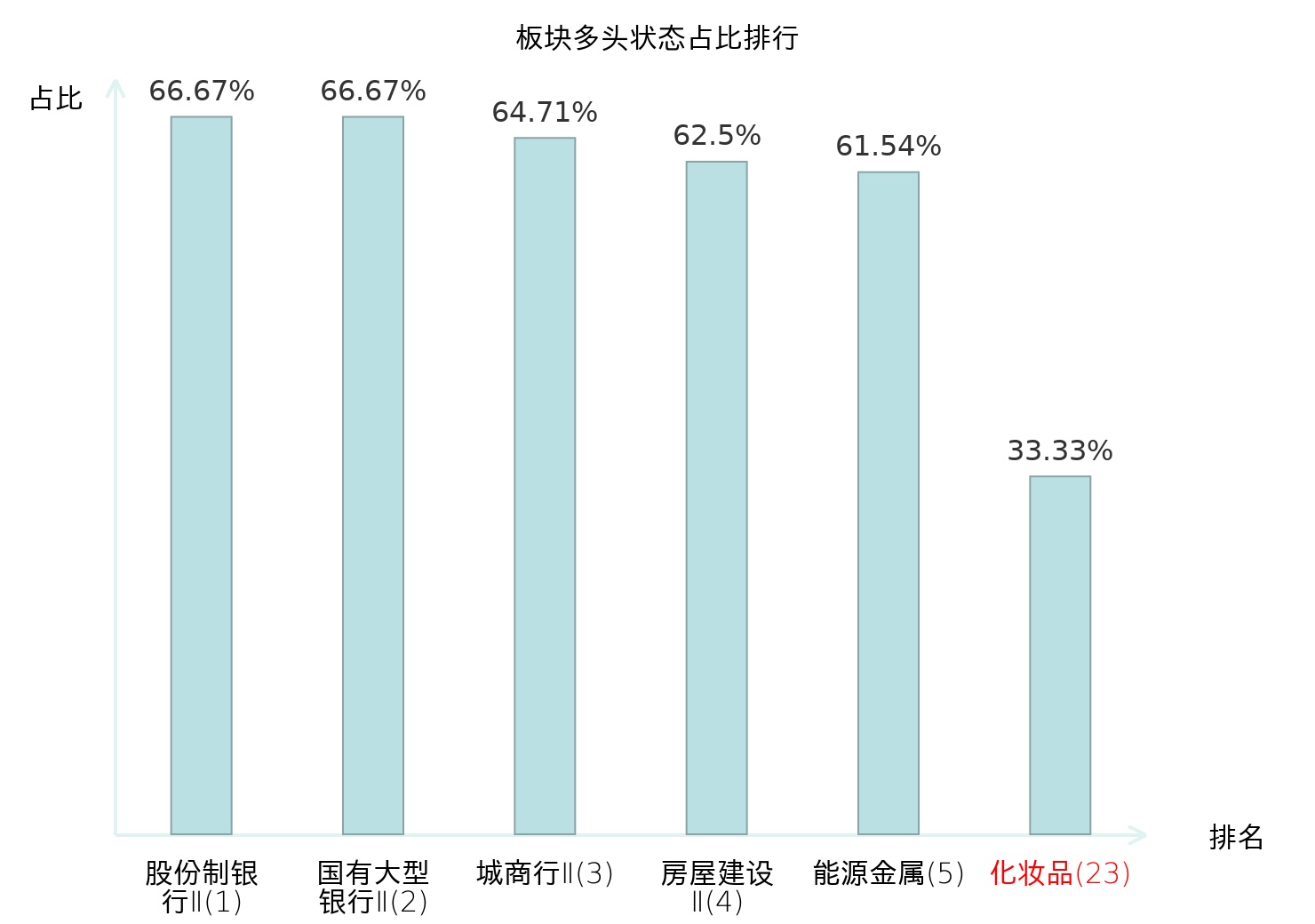 全市场所有行业板块中主力多头状态占比排名中,股份制银行Ⅱ板块位居第一。其他家电Ⅱ板块名次提升最快,较昨日上升102位。
