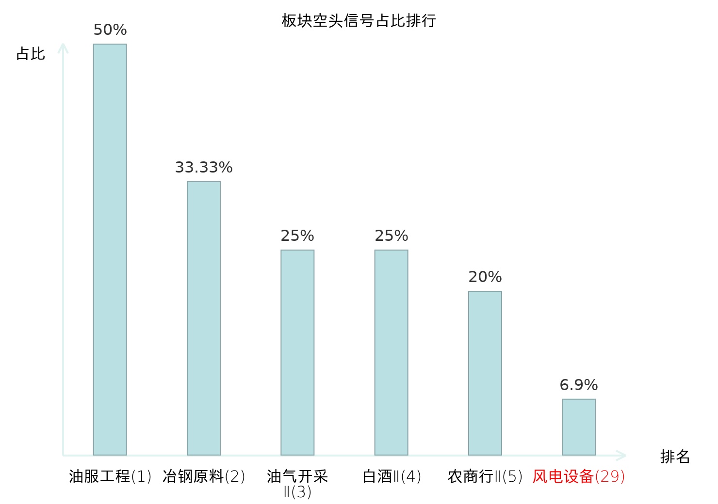 全市场所有行业板块中主力空头信号占比排名中,油服工程板块位居第一。白酒Ⅱ板块名次提升最快,较昨日上升110位。