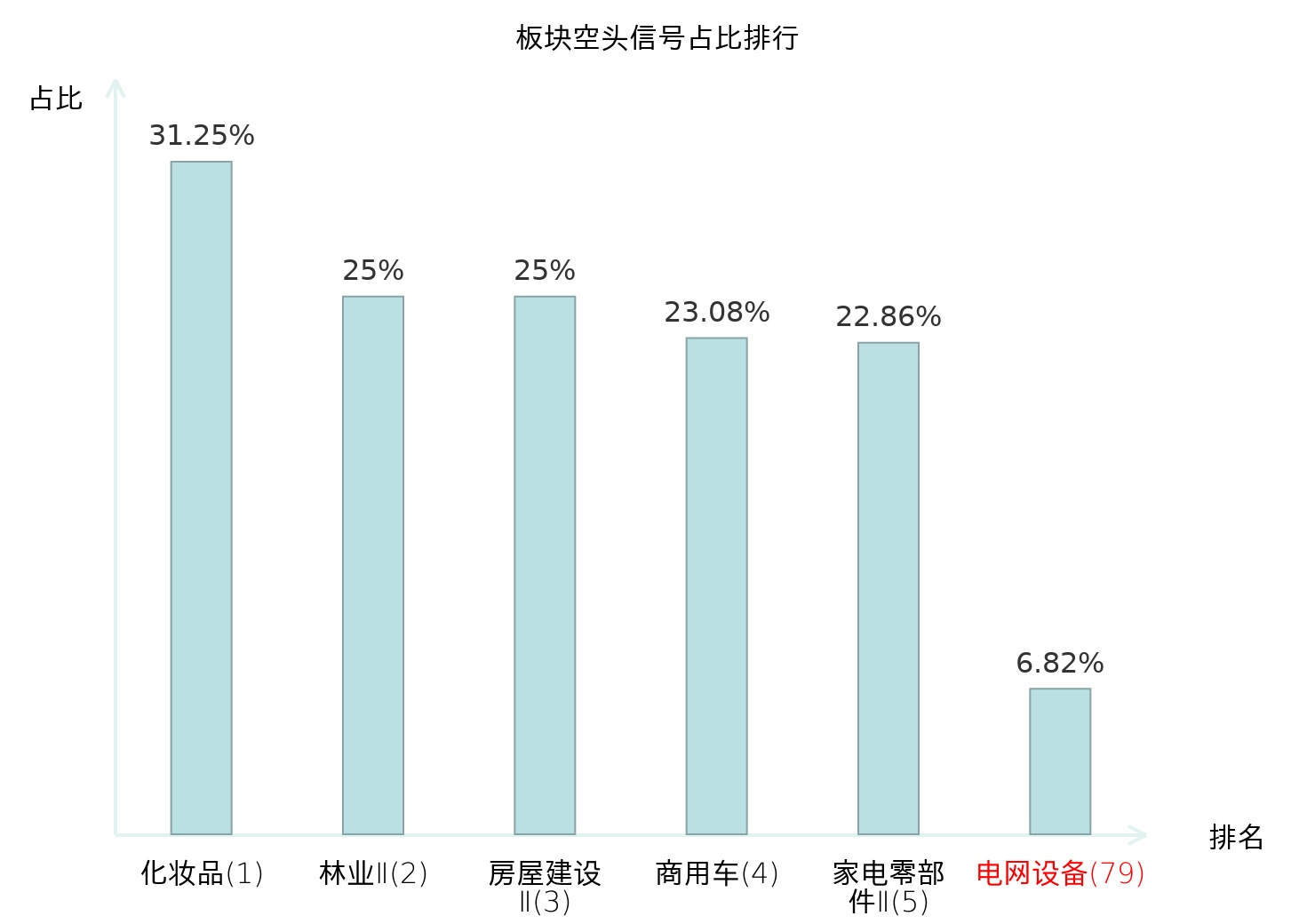 全市场所有行业板块中主力空头信号占比排名中,化妆品板块位居第一。房屋建设Ⅱ板块名次提升最快,较昨日上升113位。
