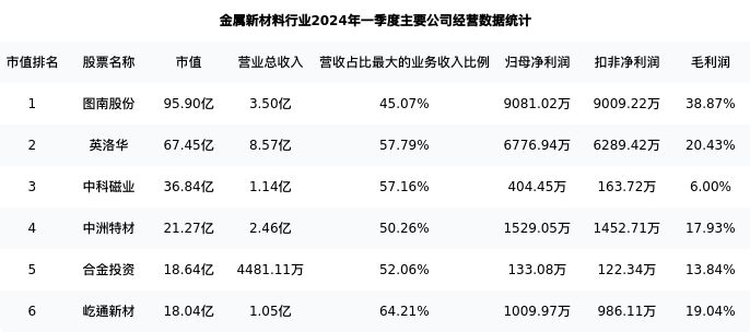 图南股份最新报告期数据为一季度,下表汇总了金属新材料行业内市值靠前的公司一季度主要经营数据