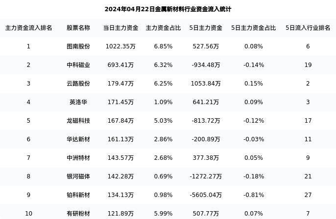 从主力资金流向来看,金属新材料行业今日主力资金流入3.97亿元,在所有申万二级行业中排名:115/131。