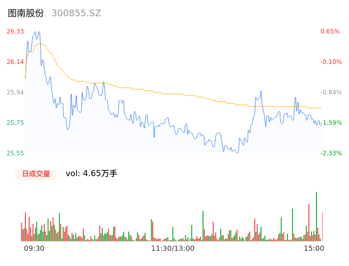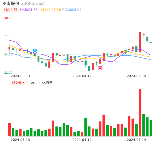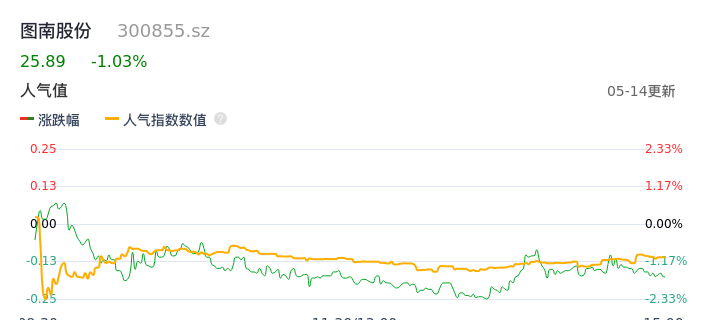 05月14日,图南股份收报25.89,股价涨幅-1.03%,成交金额1.20亿元,换手率1.64%。