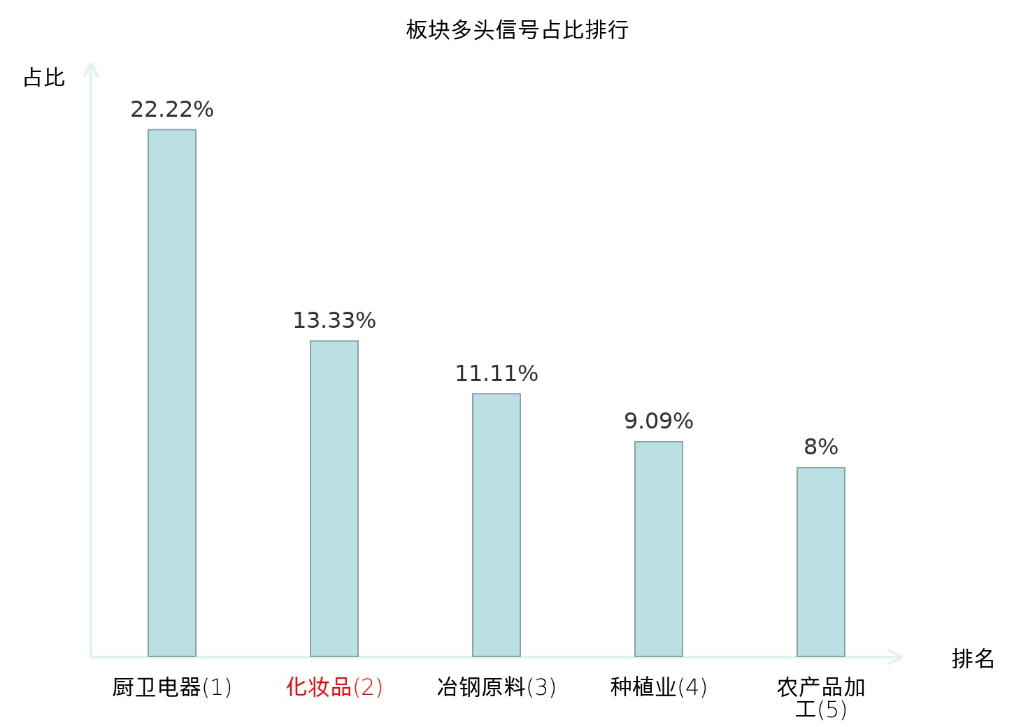 全市场所有行业板块中主力多头信号占比排名中,厨卫电器板块位居第一。化妆品板块名次提升最快,较昨日上升104位。