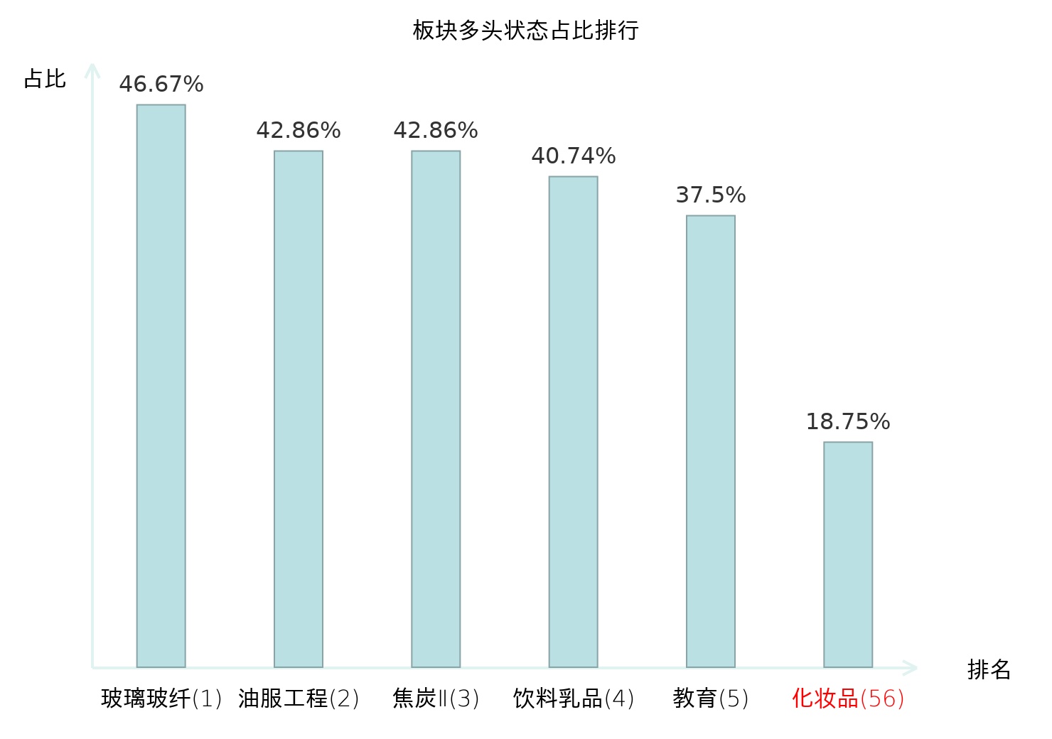全市场所有行业板块中主力多头状态占比排名中,玻璃玻纤板块位居第一。航空机场板块名次提升最快,较昨日上升43位。