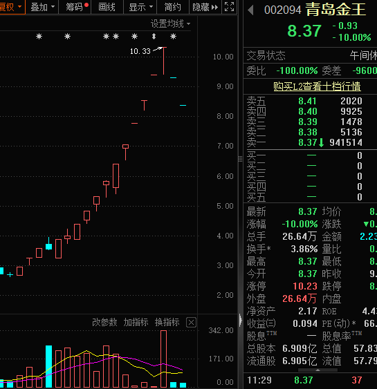 青岛金王早盘直接一字跌停,跌停板封单一度超百万手。该公司此前在10月11日至11月1日期间的17个交易日内,收获13个涨停板。11月4日该股一字跌停,今日早盘再次跌停。