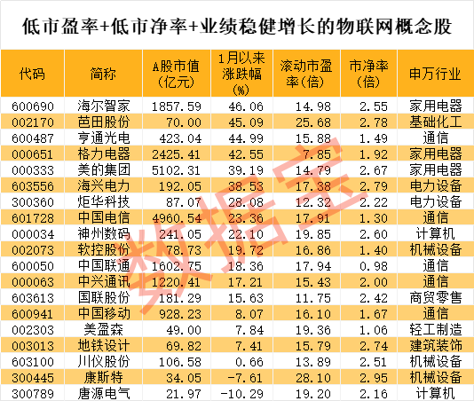 滚动市盈率低于30倍,且市净率(PB)低于3倍的概念股有19只,6只千亿以上市值的巨头公司入围,分别是美的集团、中国电信、格力电器、海尔智家、中国联通、中兴通讯。今年以来这19股平均上涨21.42%,跑赢同期上证指数。其中海尔智家、芭田股份、亨通光电、格力电器累计涨幅在40%以上。