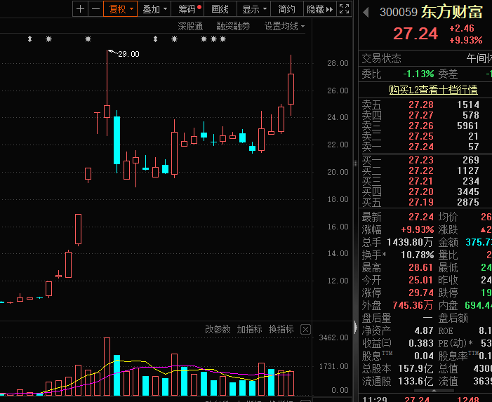 早盘A股合计成交1.43万亿元,互联金融概念的龙头东方财富成交额高达375.7亿元,问鼎早盘成交榜冠军,该股盘中一度涨超15%,逼近历史高点,午间收盘时涨幅回落至9.93%。早盘成交额破百亿元的还有赛力斯、常山北明、欧菲光、中国长城、通富微电等。