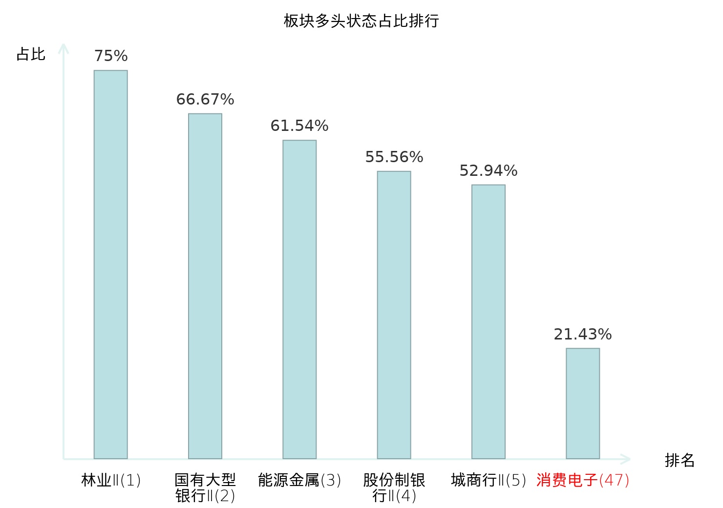 全市场所有行业板块中主力多头状态占比排名中,林业Ⅱ板块位居第一。动物保健Ⅱ板块名次提升最快,较昨日上升82位。