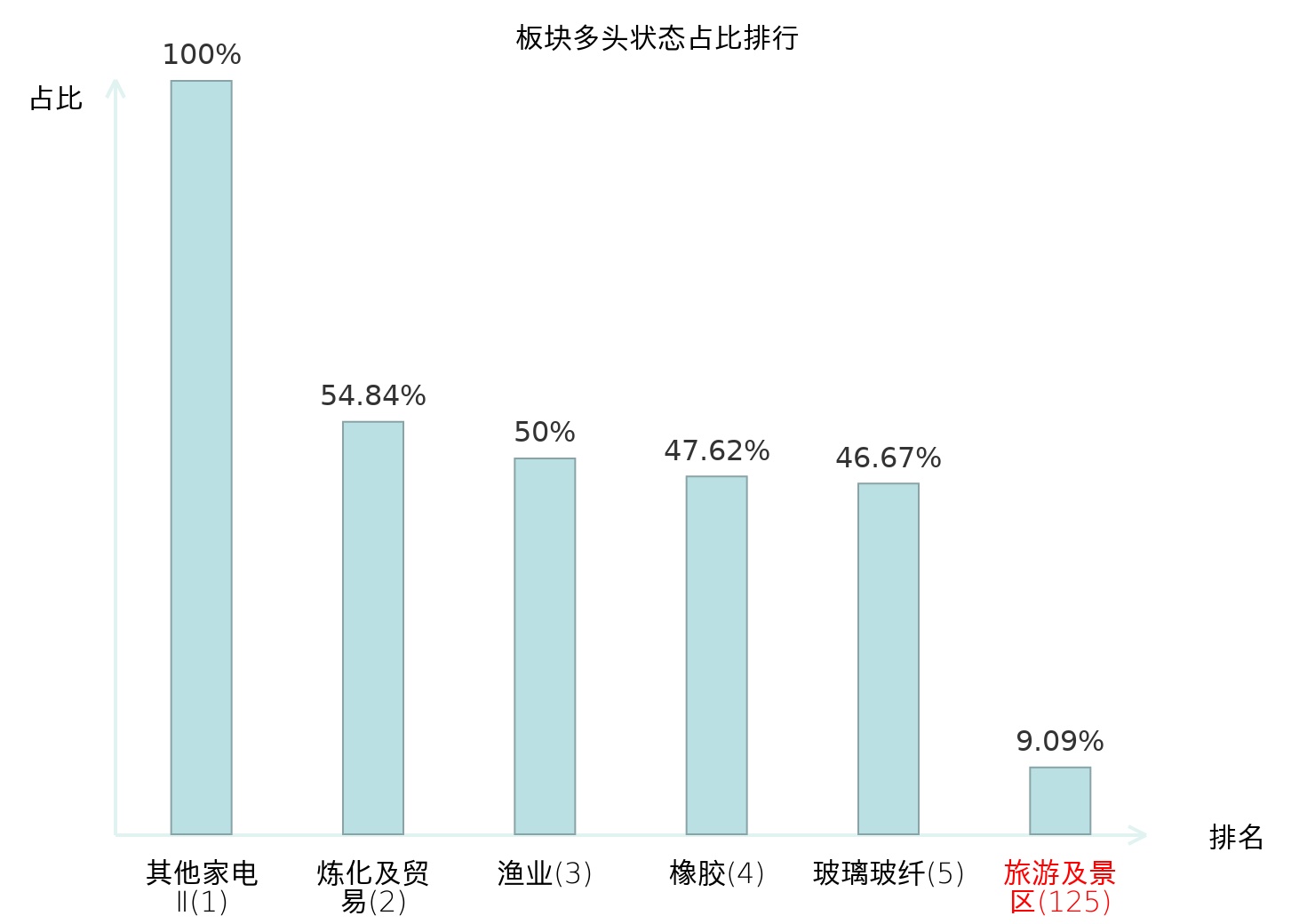 全市场所有行业板块中主力多头状态占比排名中,其他家电Ⅱ板块位居第一。铁路公路板块名次提升最快,较昨日上升37位。