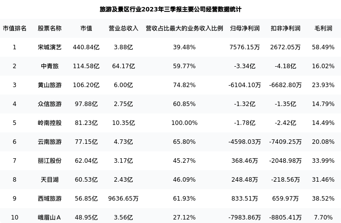 西域旅游最新报告期数据为三季报,下表汇总了旅游及景区行业内市值靠前的公司三季报主要经营数据