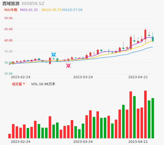 04月21日,西域旅游收报39.59,股价涨幅-5.89%,成交金额7.10亿元,换手率17.72%。