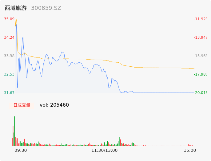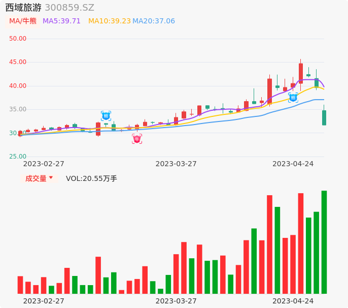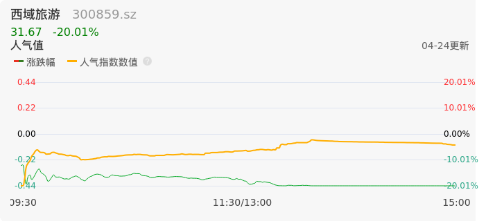 04月24日,西域旅游收报31.67,股价涨幅-20.01%,成交金额6.74亿元,换手率21.47%。