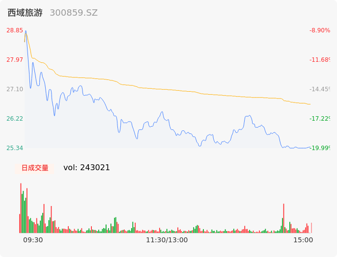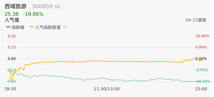 04月25日,西域旅游收报25.38,股价涨幅-19.86%,成交金额6.47亿元,换手率25.39%。