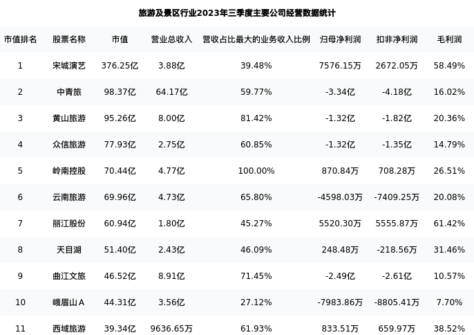 西域旅游最新报告期数据为三季度,下表汇总了旅游及景区行业内市值靠前的公司三季度主要经营数据