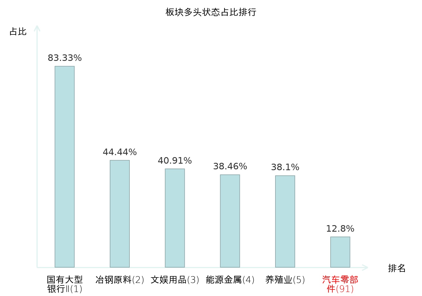 全市场所有行业板块中主力多头状态占比排名中,国有大型银行Ⅱ板块位居第一。影视院线板块名次提升最快,较昨日上升54位。