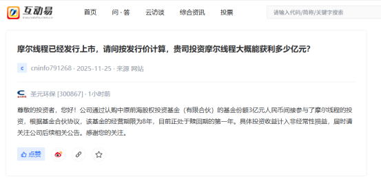 上证报中国证券网讯 圣元环保11月26日在互动平台回答投资者提问时表示,公司通过认购中原前海股权投资基金(有限合伙)的基金份额3亿元人民币间接参与了摩尔线程的投资,根据基金合伙协议,该基金的经营期限为8年,目前正处于赎回期的第一年。具体投资收益计入非经常性损益,届时请关注公司后续相关公告。
