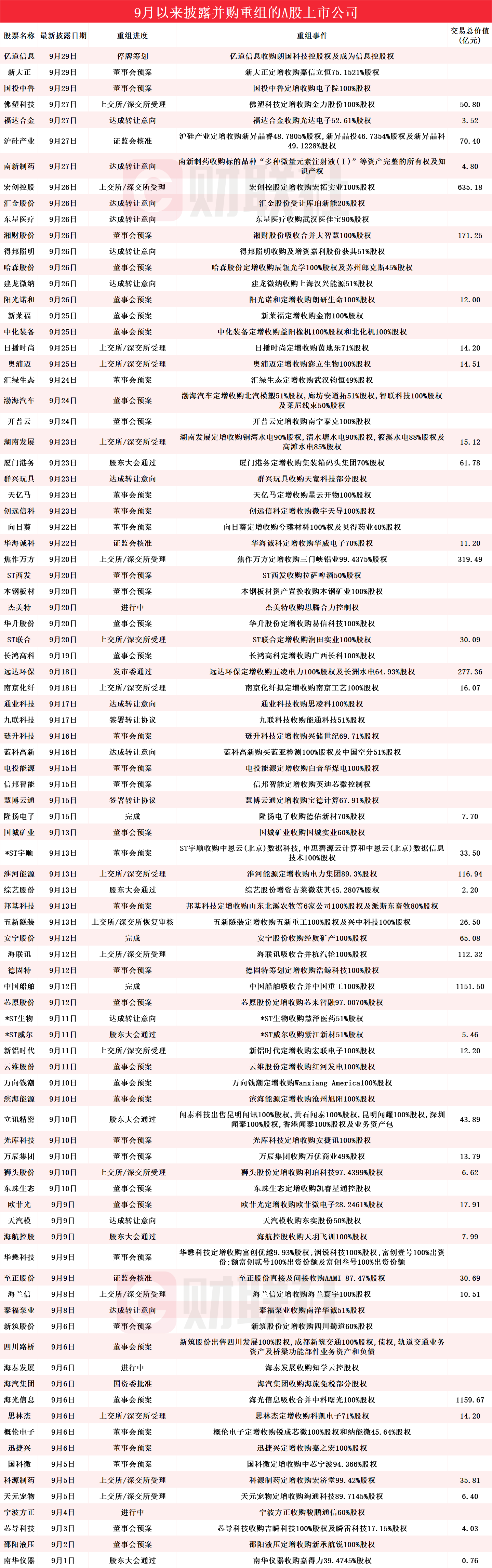 据财联社不完全统计,并结合Wind数据,选取参与角色为竞买方,剔除重组失败,9月以来披露重大并购重组进展的A股上市公司共有90家,分别为亿道信息、新大正国投中鲁佛塑科技福达合金沪硅产业南新制药宏创控股汇金股份东星医疗湘财股份得邦照明哈森股份建龙微纳阳光诺和新莱福、中化装备、日播时尚奥浦迈汇绿生态渤海汽车开普云湖南发展厦门港务群兴玩具天亿马、创远信科、向日葵华海诚科焦作万方ST西发本钢板材杰美特、华升股份、ST联合、长鸿高科、远达环保、南京化纤通业科技、九联科技、琏升科技、蓝科高新电投能源信邦智能慧博云通隆扬电子国城矿业*ST宇顺淮河能源综艺股份邦基科技五新隧装安宁股份海联讯德固特中国船舶芯原股份、*ST生物、*ST威尔新铝时代云维股份万向钱潮滨海能源立讯精密光库科技万辰集团狮头股份东珠生态欧菲光天汽模海航控股华懋科技至正股份海兰信泰福泵业新筑股份四川路桥海泰发展海汽集团海光信息思林杰概伦电子迅捷兴国科微科源制药天元宠物宁波方正、芯导科技、邵阳液压南华仪器。具体情况如下图: