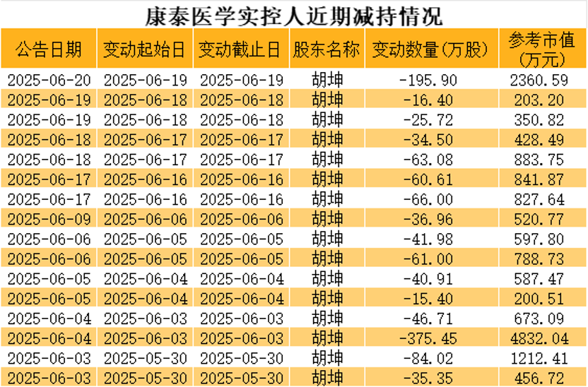 尤为引人关注的是,实控人、董事长胡坤在2025年5月至6月期间减持金额接近1.6亿元,该期间几乎是康泰医学股价历史最低价区域。
