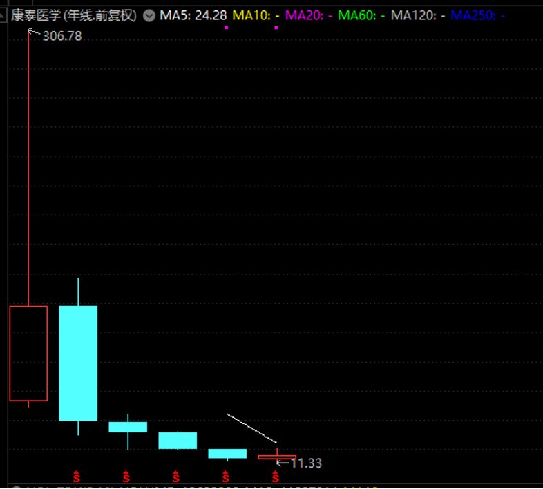 然而,高光仅存一日。此后五年,康泰医学股价一路下行,从308元/股高点跌至最新的16.15元/股,高点以来跌幅超过94%,市值从峰值超1200亿元缩水至最新的65亿元左右,蒸发近1173亿元。