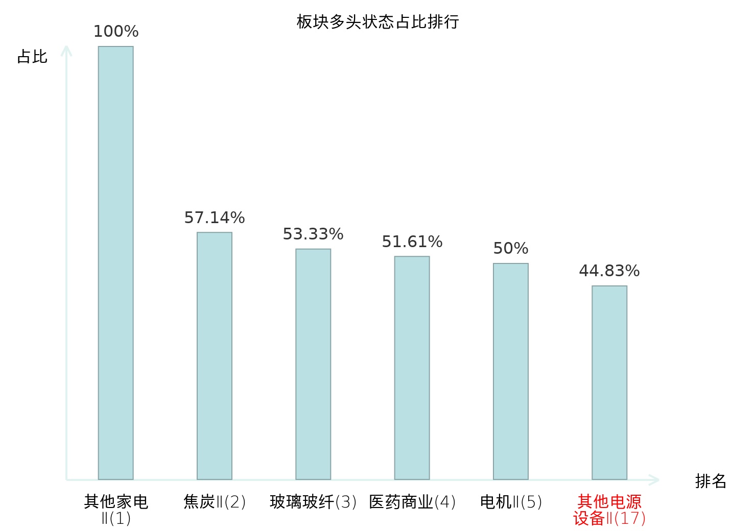 全市场所有行业板块中主力多头状态占比排名中,其他家电Ⅱ板块位居第一。白色家电板块名次提升最快,较昨日上升67位。
