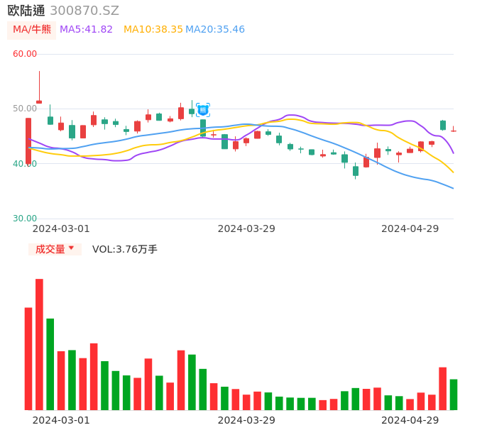 04月29日,欧陆通收报45.96,股价涨幅-0.50%,成交金额1.74亿元,换手率3.72%。