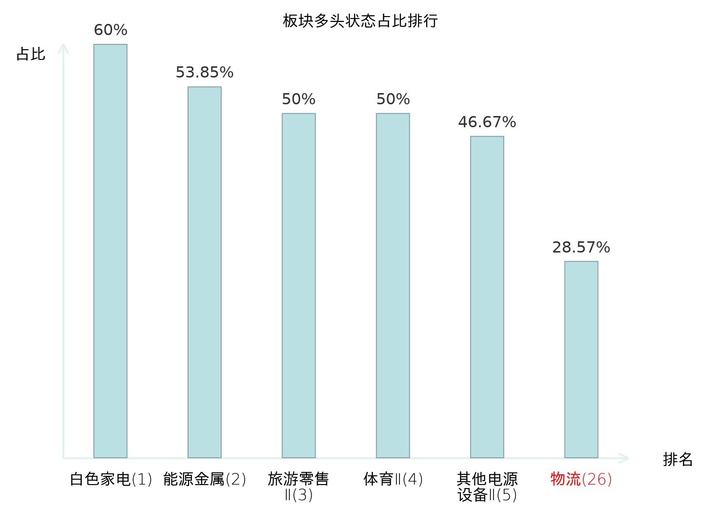 全市场所有行业板块中主力多头状态占比排名中,白色家电板块位居第一。体育Ⅱ板块名次提升最快,较昨日上升127位。