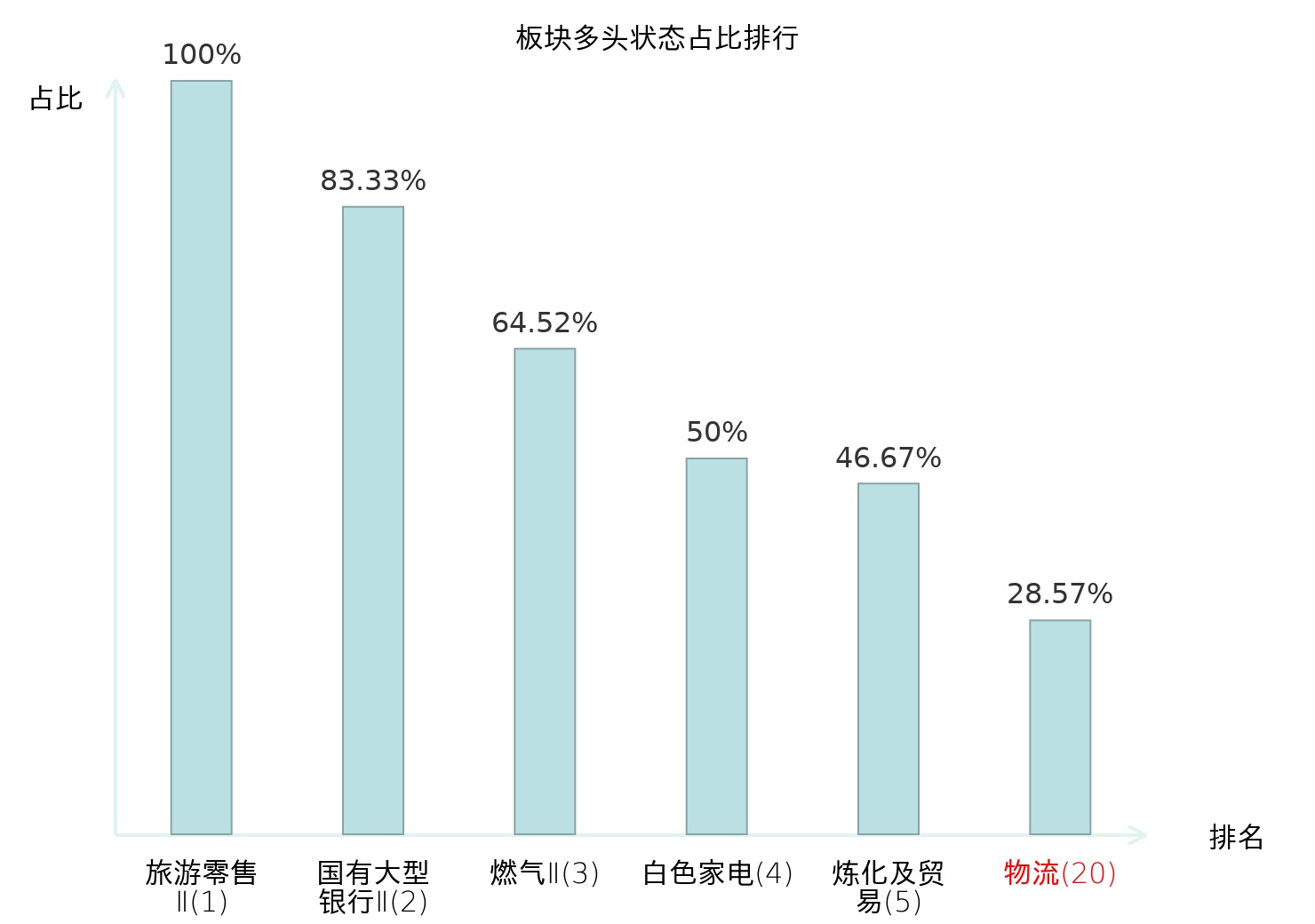 全市场所有行业板块中主力多头状态占比排名中,旅游零售Ⅱ板块位居第一。农产品加工板块名次提升最快,较昨日上升82位。