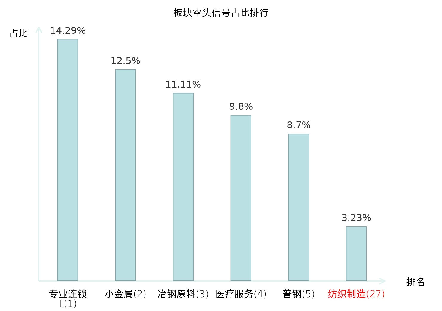 全市场所有行业板块中主力空头信号占比排名中,专业连锁Ⅱ板块位居第一。军工电子Ⅱ板块名次提升最快,较昨日上升106位。