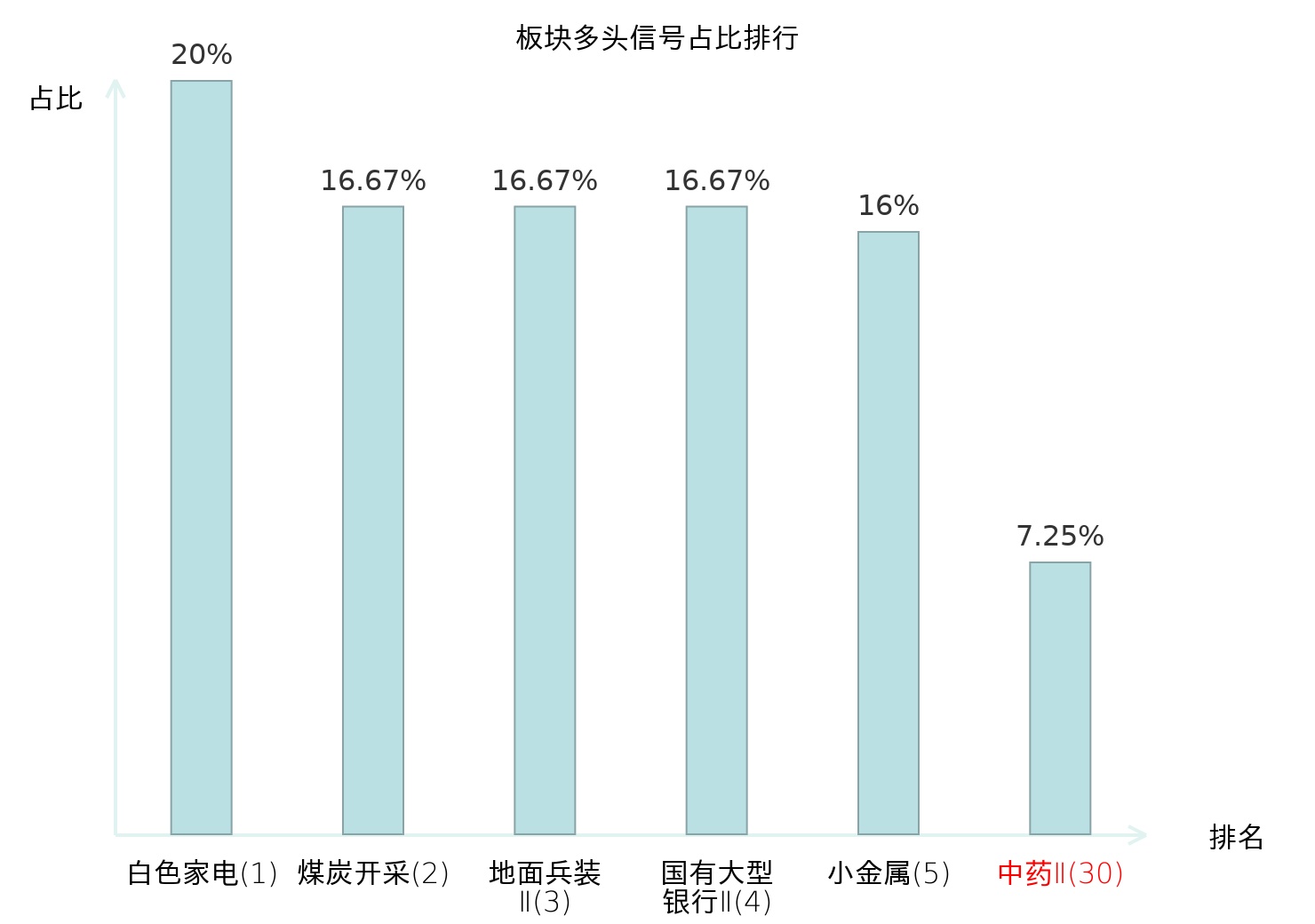 全市场所有行业板块中主力多头信号占比排名中,白色家电板块位居第一。国有大型银行Ⅱ板块名次提升最快,较昨日上升119位。