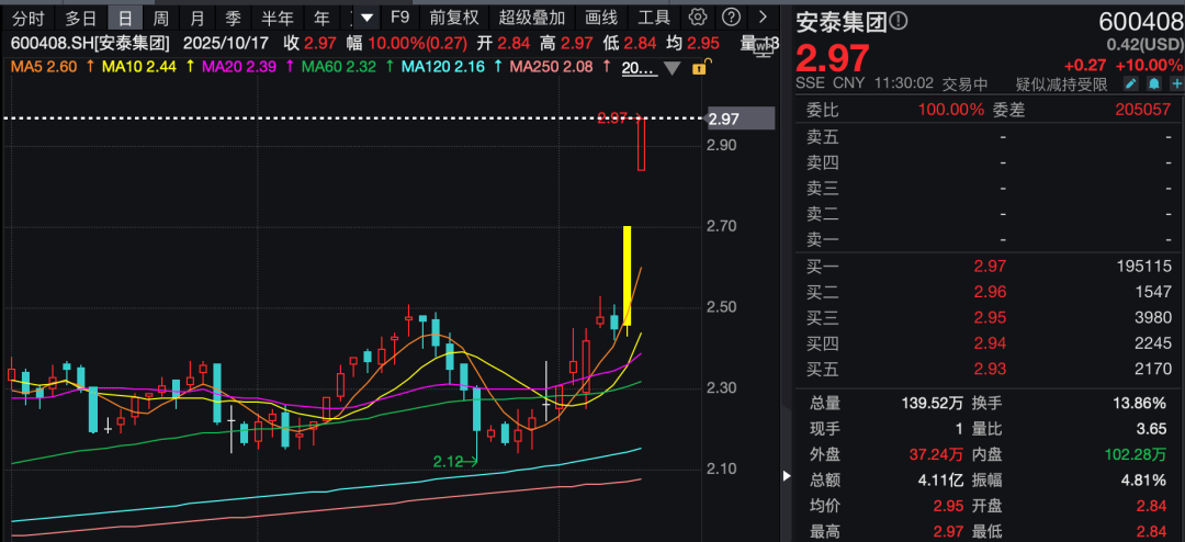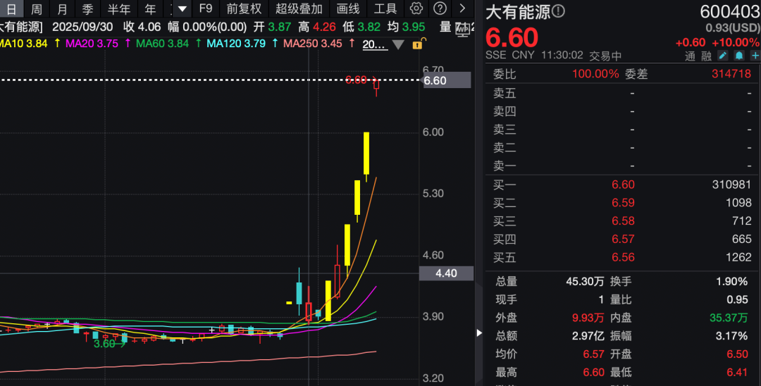 煤炭股今日继续保持强势,板块指数日K线连续8日走阳,再创年内新高。大有能源(600403)高开后秒速涨停,收获6天5板涨停,股价创2016年6月以来9年多新高(复权);安泰集团亦秒速封板,连续第2日涨停,股价创近2年新高;宝泰隆、云煤能源等多股也一度冲击涨停,并创阶段性新高。
