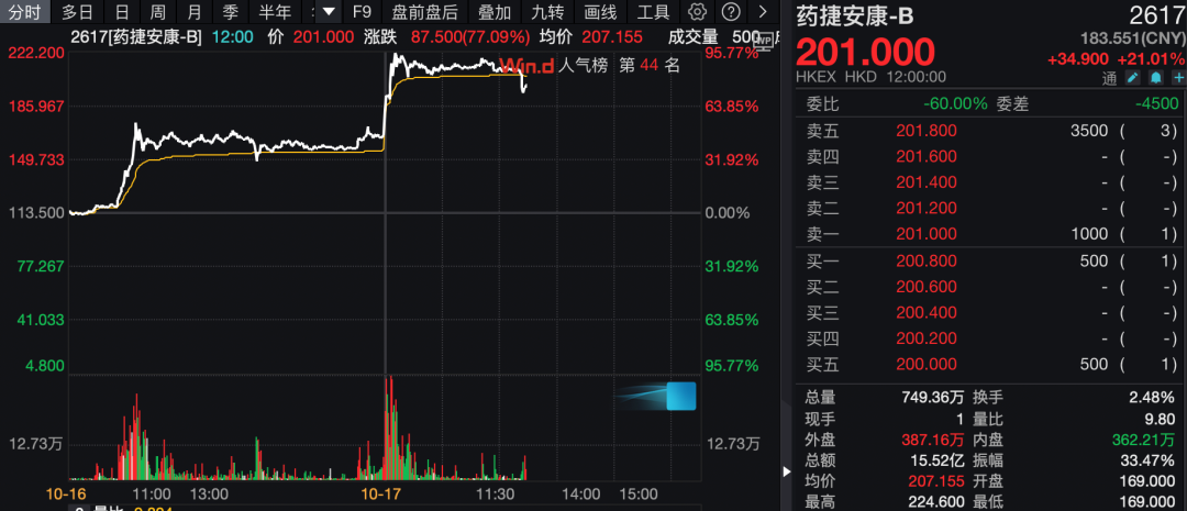 港股市场,药捷安康在昨日大涨46.34%的基础上,今日早间再度直线拉升,盘中最多一度涨逾35%,2日累计涨幅接近100%。轩竹生物、三叶草生物、康宁杰瑞制药等涨幅也超10%。