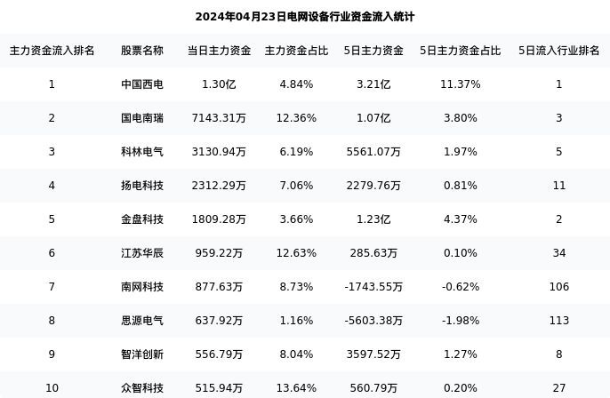 从主力资金流向来看,电网设备行业今日主力资金流入41.42亿元,在所有申万二级行业中排名:70/131。