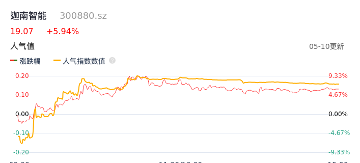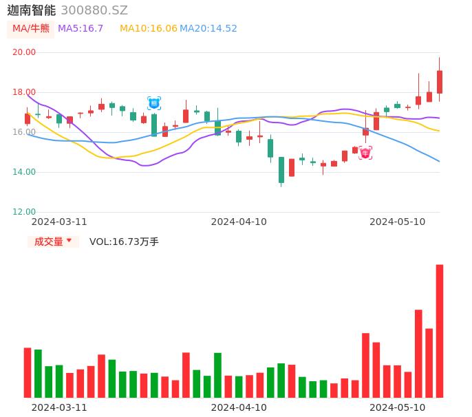 05月10日,迦南智能收报19.07,股价涨幅5.94%,成交金额3.17亿元,换手率8.62%。