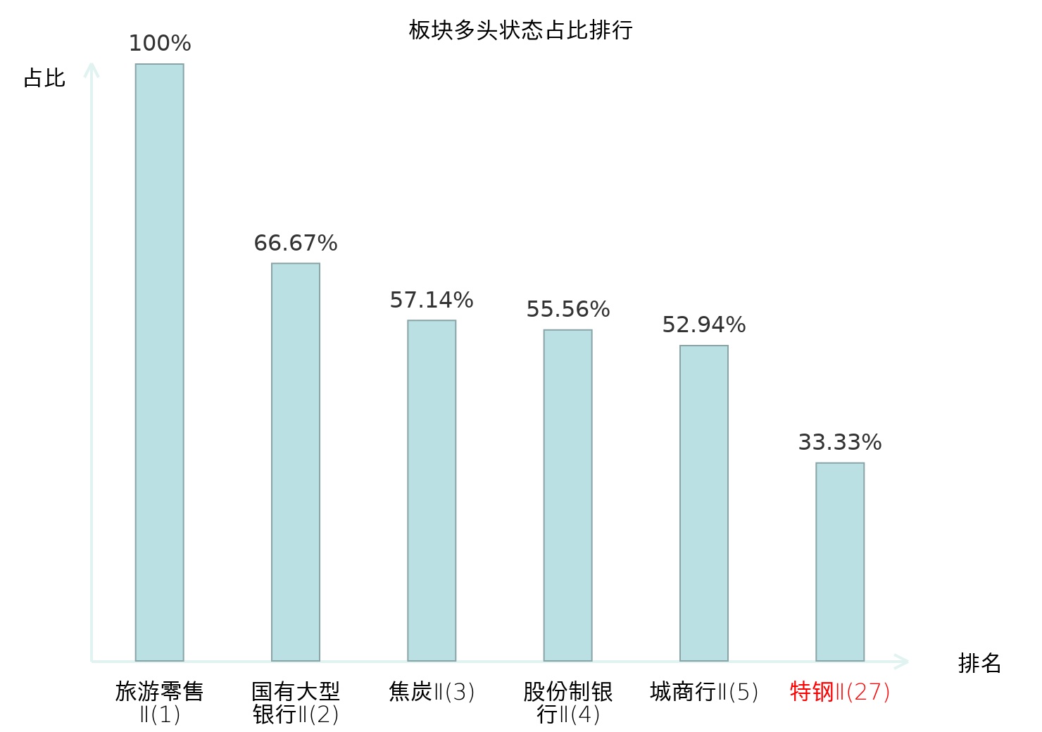 全市场所有行业板块中主力多头状态占比排名中,旅游零售Ⅱ板块位居第一。其他家电Ⅱ板块名次提升最快,较昨日上升101位。