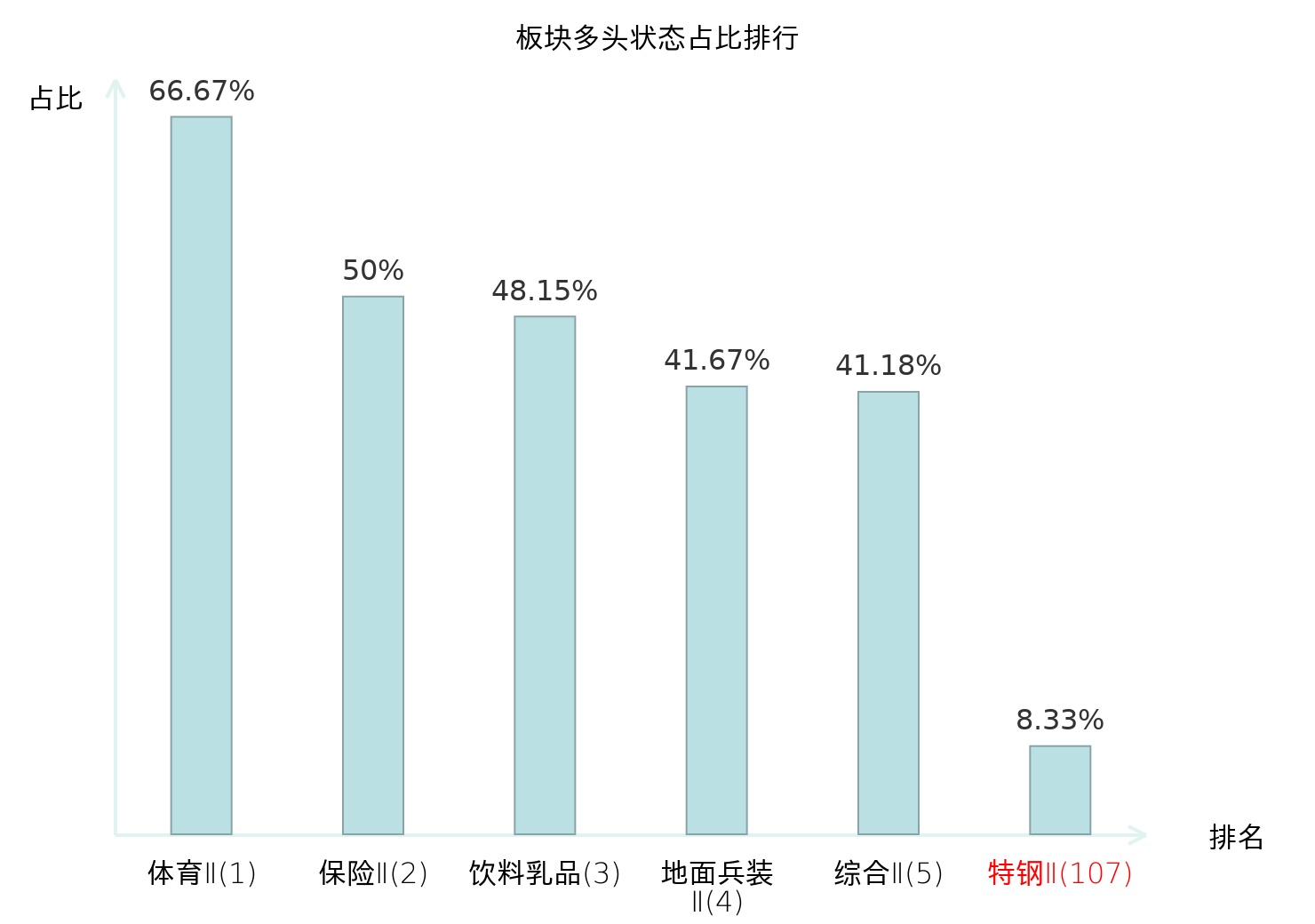 全市场所有行业板块中主力多头状态占比排名中,体育Ⅱ板块位居第一。种植业板块名次提升最快,较昨日上升70位。