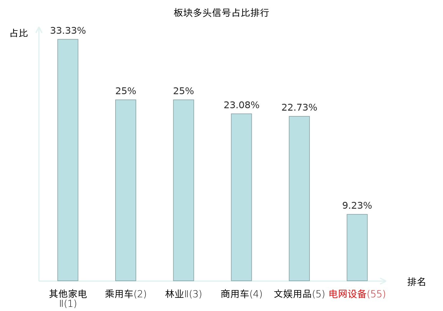 全市场所有行业板块中主力多头信号占比排名中,其他家电Ⅱ板块位居第一。林业Ⅱ板块名次提升最快,较昨日上升124位。