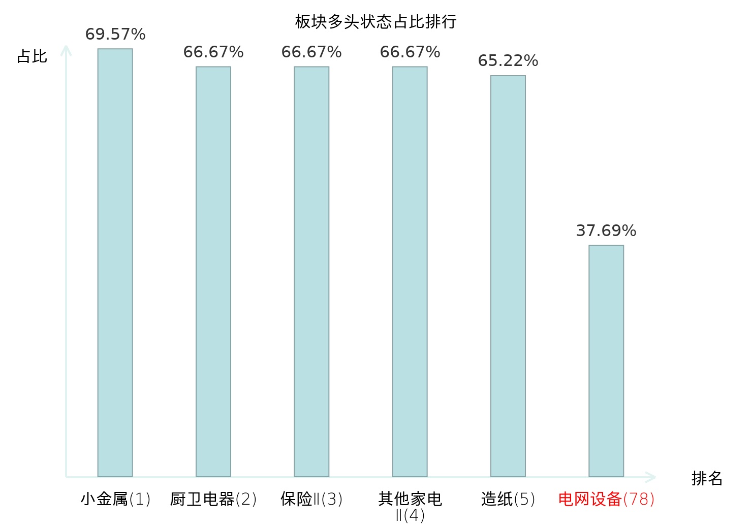 全市场所有行业板块中主力多头状态占比排名中,小金属板块位居第一。林业Ⅱ板块名次提升最快,较昨日上升86位。