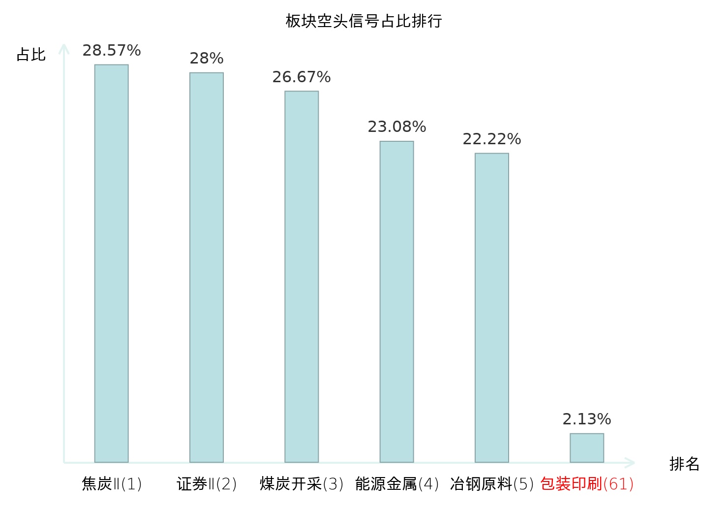 全市场所有行业板块中主力空头信号占比排名中,焦炭Ⅱ板块位居第一。煤炭开采板块名次提升最快,较昨日上升128位。