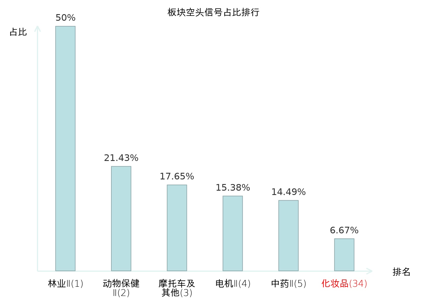 全市场所有行业板块中主力空头信号占比排名中,林业Ⅱ板块位居第一。动物保健Ⅱ板块名次提升最快,较昨日上升109位。