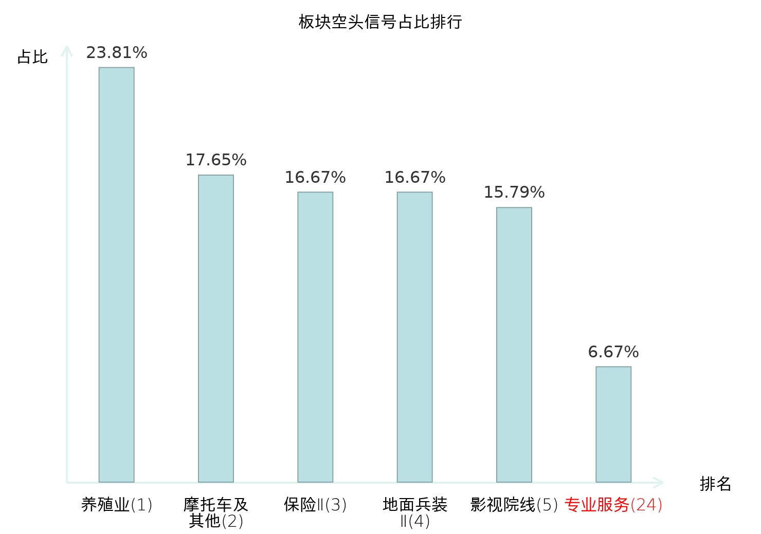 全市场所有行业板块中主力空头信号占比排名中,养殖业板块位居第一。养殖业板块名次提升最快,较昨日上升114位。