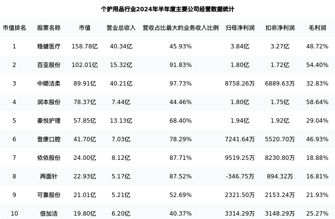 稳健医疗最新报告期数据为半年度,下表汇总了个护用品行业内市值靠前的公司半年度主要经营数据