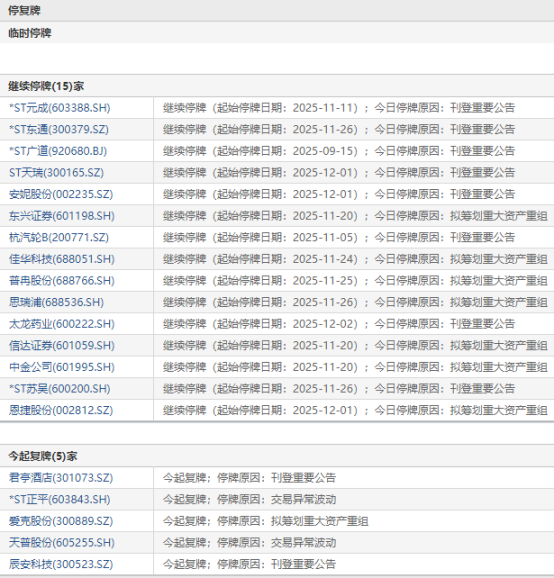 上证报中国证券网讯 12月3日,5家公司复牌:君亭酒店、*ST正平、爱克股份、天普股份、辰安科技。